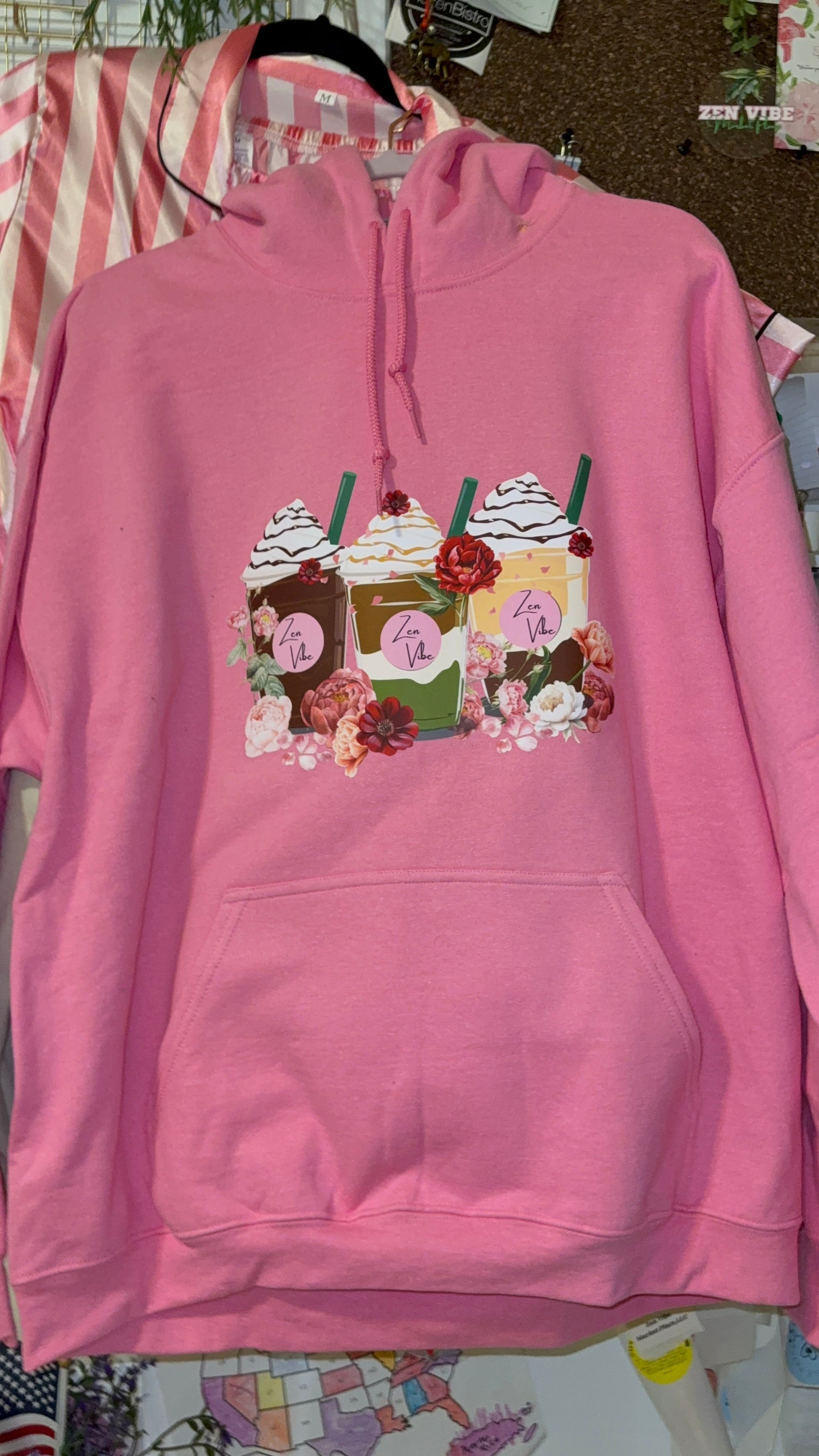 Zen Vibe Latte and peonies Hoodie | Adult unisex | front print